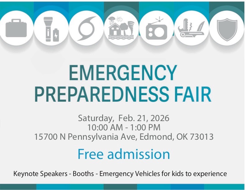 This Saturday, February 21st is a Community Emergency Preparedness Fair from 10:00am-1:00pm at The Church of Jesus Christ of Latter-day Saints, 15700 N Pennsylvania Ave, Edmond, OK 73013. This event is FREE and will have informational booths, emergency vehicles to explore, and keynote speakers.